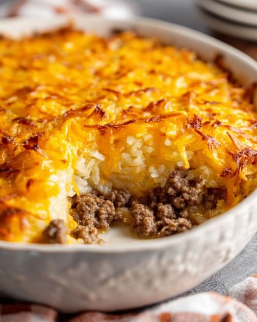 In einer großen Rührschüssel das gekochte Hackfleisch, den geriebenen Cheddar-Käse und die gefrorenen Rösti vermengen. Gut durchmischen, bis alles gleichmäßig verteilt ist.