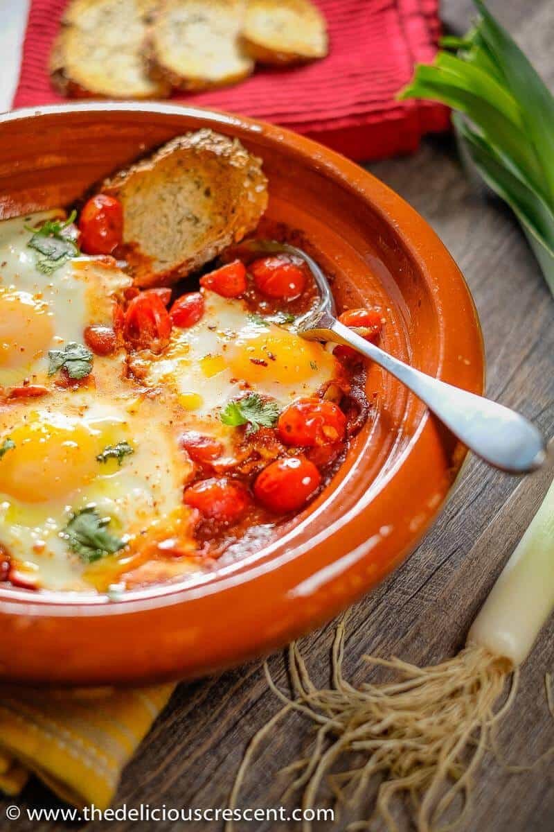 - Nachdem die Eier zur Tomatensoße gegeben wurden, kann die Mischung auch in den Ofen geschoben und bei 200 Grad Celsius (400 Grad Fahrenheit) 6 bis 10 Minuten lang fertig gebacken werden, je nachdem, wie durchgebraten man die Eier mag.