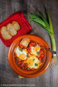 Shakshuka ist ein einfaches und köstliches Gericht aus pochierten Eiern in einer würzigen Tomatensoße mit Zwiebeln, Chilischoten und Kräutern. Es stammt ursprünglich aus Nordafrika, wobei einige Quellen darauf hinweisen, dass die beliebte Variante speziell aus der tunesischen Küche kommt.
