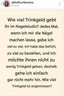 Trinkgeld im Nagelstudio wird oft als Kleinigkeit betrachtet, hat aber eine Bedeutung, die weit über die Endabrechnung hinausgeht. Es ist eine Mischung aus Etikette, Wirtschaftlichkeit und zwischenmenschlicher Interaktion und prägt das Erlebnis für Kundin und Nageldesignerin gleichermaßen. Nageldesignerinnen leisten präzise Handarbeit, die Hygiene, technisches Können und Kreativität vereint, oft unter körperlich anstrengenden Bedingungen. Langes Arbeiten über Händen und Füßen erfordert Konzentration, Ausdauer und Geduld. Für viele Nageldesignerinnen sind Trinkgelder kein optionaler Bonus, sondern ein wesentlicher Bestandteil ihres Einkommens und helfen, ihr bescheidenes Grundgehalt aufzubessern. Ein Trinkgeld drückt daher mehr aus als nur Zufriedenheit mit dem Ergebnis; es würdigt Einsatz, Professionalität und Sorgfalt.